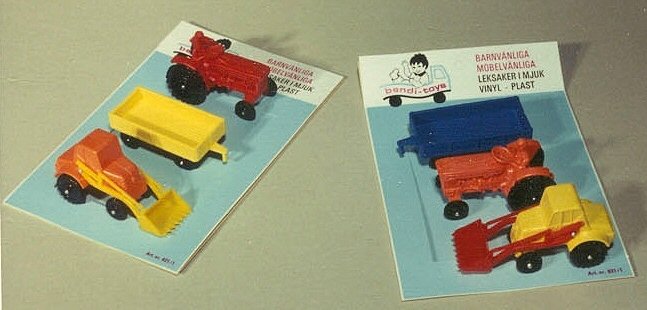 Här ovan visas en orginalförpackning med en lastbil och en bärgningsbil. Ett stort försäljningsargument på 1970-talet verkar ha varit att bilarna var "Barnvänliga", "Barnsäkra" och "Möbelvänliga".